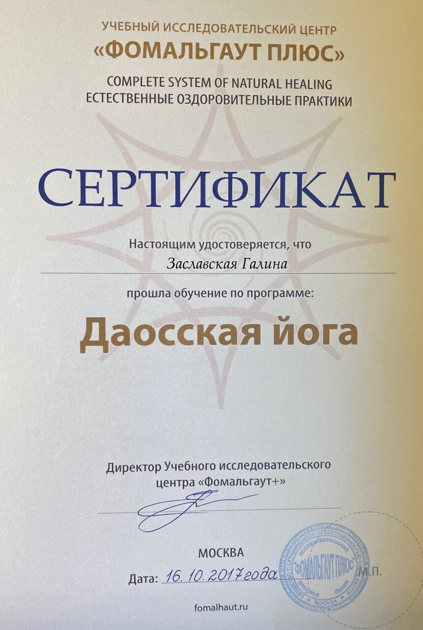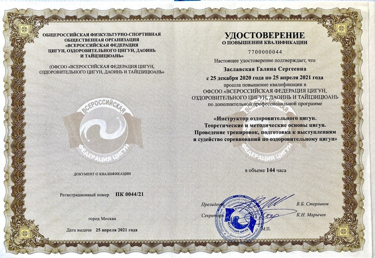 - Инструктор и преподаватель Всероссийской Федерации Оздоровительного Цигун, Даоинь и Тайцзицюань